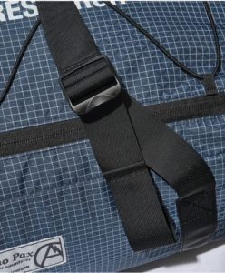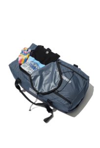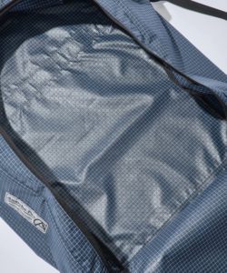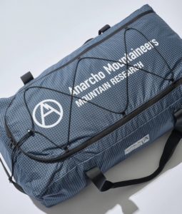 2wayダッフルバックは、初期UL的なバックパック製作の延長線上にあるオリジナル軽量ラゲッジ・ギア。ホワイトグリッド・ナイロン、バンジーコードを筆頭に、U字ファスナーでフル開口するトップ、ストラップのアジャスターなど、バックパック的な要素が特徴的。トップには、A.M.プリント、底にはH.I.T.M.ならぬ