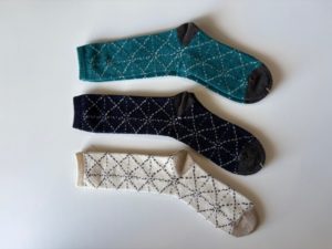 刺し子のデザインをソックスに落とし込んでいます。ふわりと優しいモール糸を使用しています。