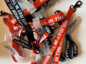 “HOLIDAY IN THE MOUNTAIN ” のジャガード織テープを使用したネックストラップ